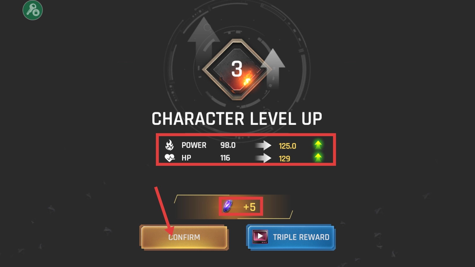 角色完成【CHARACTER-LEVEL-UP】升级后,其【POWER】与【HP】属性将得到提升,同时可获取对应奖励;请点击【CONFIRM】按钮以继续流程,后续可通过积累资源进一步助力角色升级。
