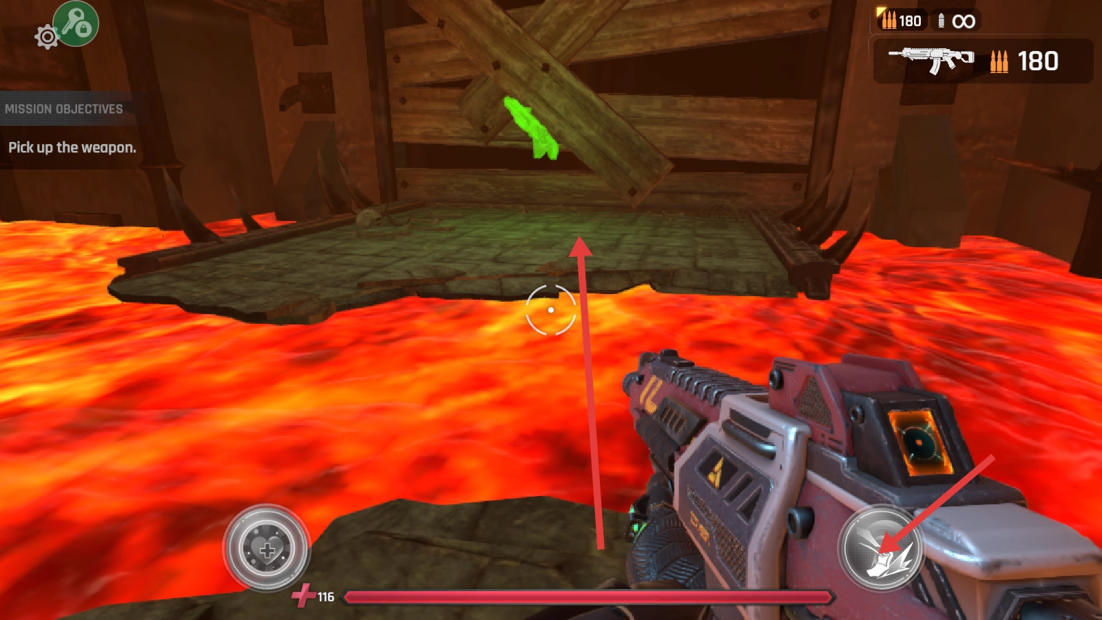 根据【Pick-up-the-weapon】任务要求,需拾取带有绿色标识的新武器,并借助武器技能按钮来增强战斗能力。