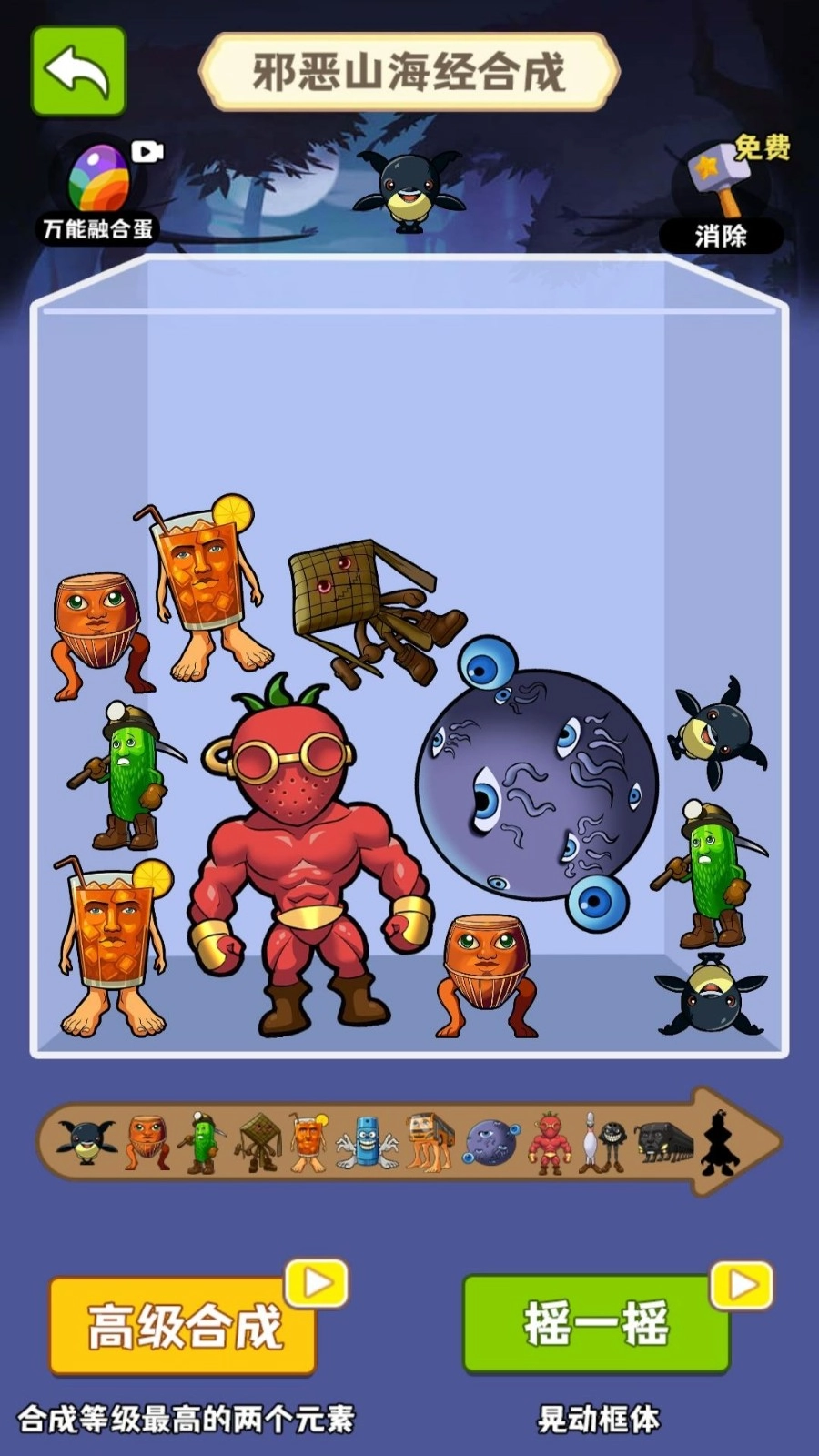 把相同的角色投放到盒子里,让它们碰撞后合成更高级的角色,这样就能不断提高角色的等级。