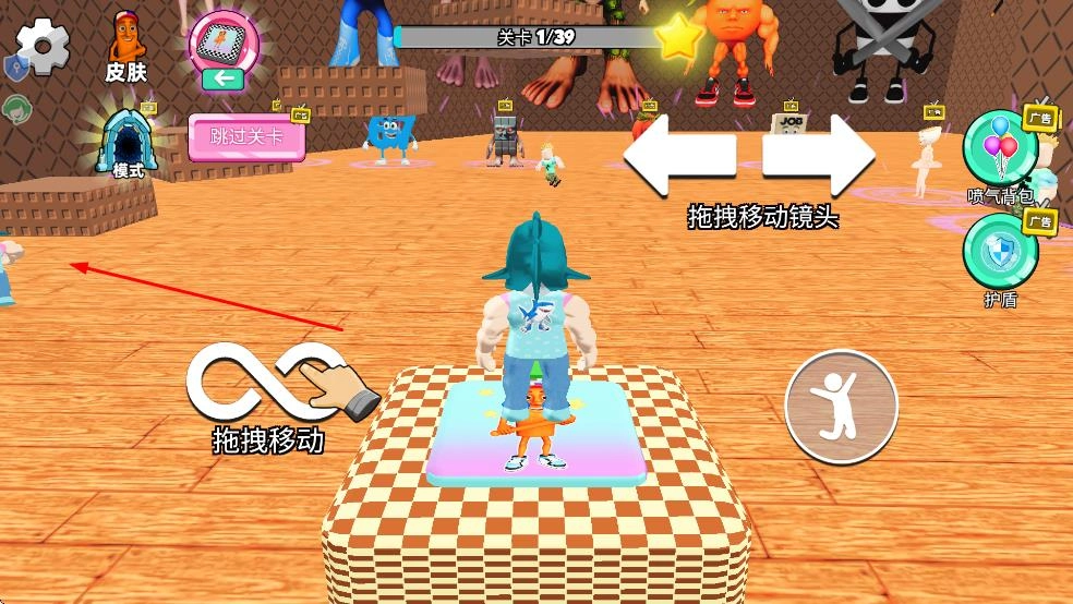 你可以通过拖拽界面里的移动按钮来操控角色在场景中移动,另外还能拖拽来调整镜头的视角。