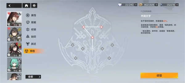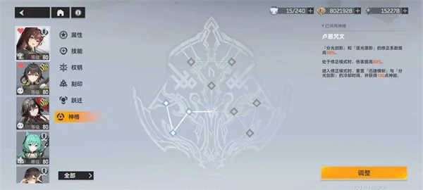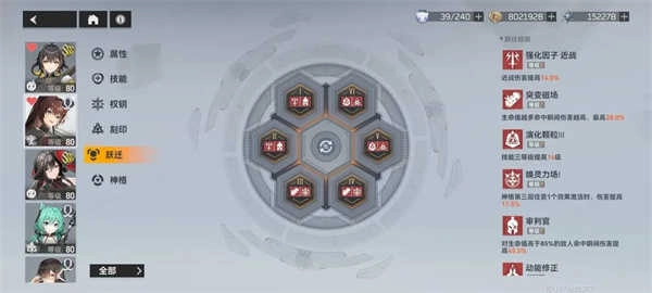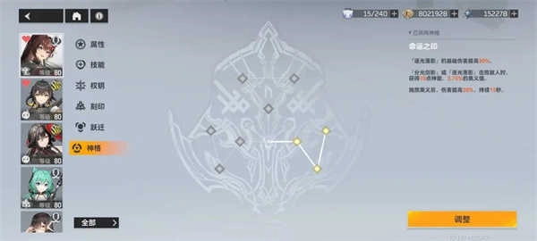 左线神格是修正空间方向的特化类型,右一神格能提高修正系数,进而增加进入修正空间的频次;右二神格的效果很直接——薇儿处于修正模式时可获得80%的【伤害提升】;右三神格的作用则是优化首次进入修正空间阶段的技能循环节奏。在这套神格配置下,薇儿丹蒂不仅拥有了强劲的爆发输出能力,还能拥有较为舒适的输出环境。