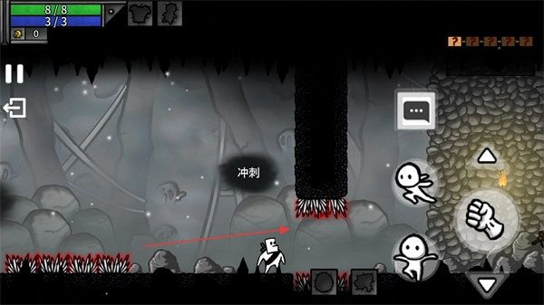 运用冲刺技能,能快速穿越带尖刺的黑色障碍这类危险区域,助力推进探索进程。