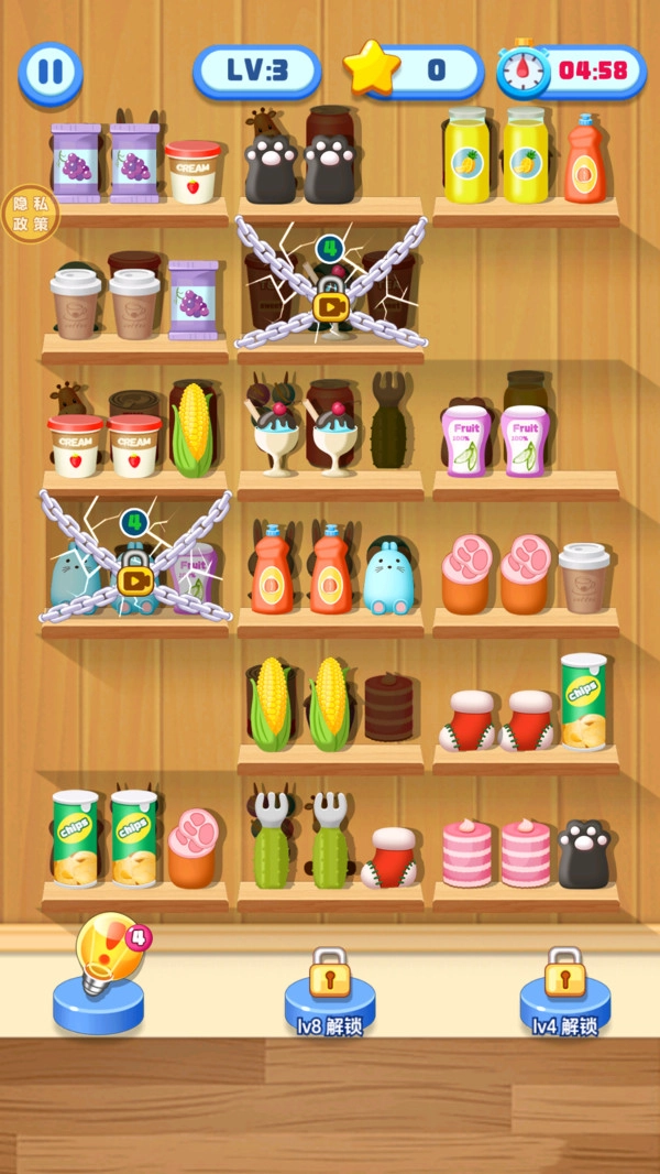 关卡的货架布局形式丰富多样,随着游戏进度的推进,物品的数量和种类会不断增多,收纳任务也从最初简单的平面整理逐步升级为复杂的立体布局,持续为玩家带来充满新鲜感的挑战。