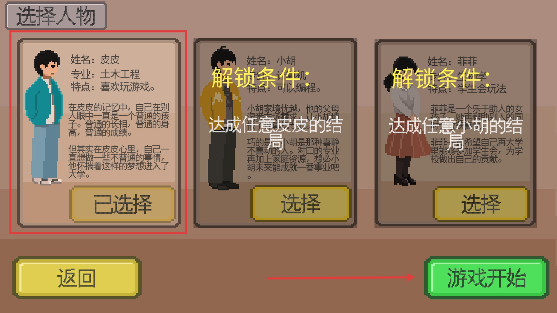 选择初始角色【皮皮-土木工程专业】,点击【游戏开始】进入剧情,体验普通学生的大学追梦路。