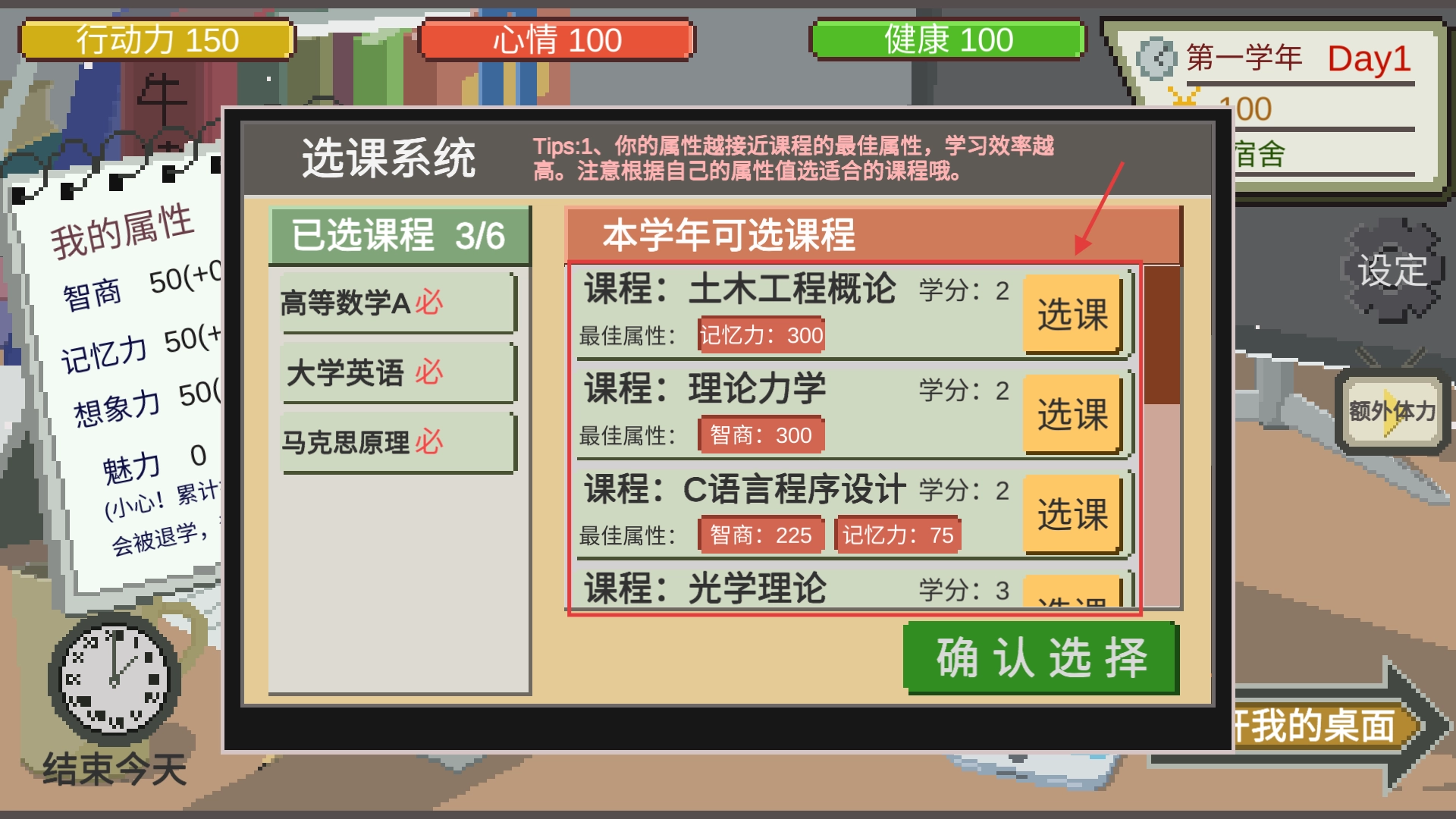 在选课界面选择【土木工程概论-学分2-记忆力300】这类课程,通过匹配属性来提升选课效率,最后点击【确认选择】按钮即可完成操作。