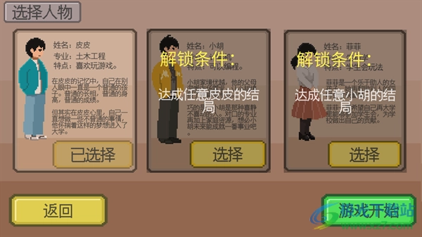 《下一站我的大学》最新版本是一款趣味十足的校园模拟游戏,玩家将化身刚踏入大学校园的大一新生,重温那段洋溢着欢笑与活力的校园时光。在游戏里,你可以自由做出各种选择:或是宅在寝室专注学习、畅玩游戏,或是勇敢走出舒适圈,竞选学生会会长,甚至成为一名游戏高手……游戏采用简洁的像素画风,却暗藏着丰富的细节设计,是一款极具可玩性的手机模拟游戏。在这里,你能真切体验大学生活的种种滋味,还有超多精彩活动等待你去探索参与。更多有趣的模拟游戏,尽在本站。