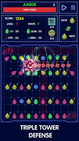 在三消塔防的手机版本里,玩家能借助合成不同等级防御塔的方式来提升自己的炮塔等级,持续增强攻击火力。升级炮塔还会为你带来更丰厚的游戏奖励。游戏采用简洁的离子塔防视觉效果,通过击败小怪物来完成升级,整体玩法轻松有趣,是一款值得体验的休闲小游戏。