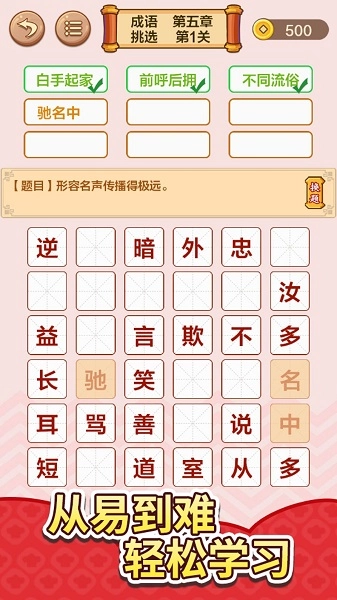 1、趣味主题挑战:涵盖节日、历史、动物等多元主题,巧妙融入成语与典故元素,让挑战过程更添乐趣。 2、道具辅助机制:配备“提示卡”“跳台”等实用道具,助力玩家在遇到瓶颈时顺利突破困境。
