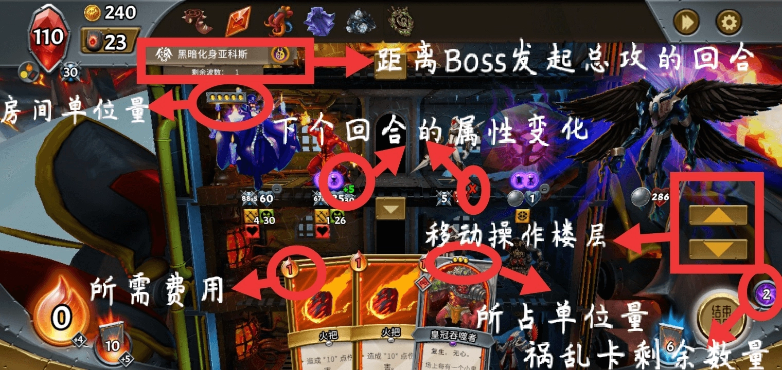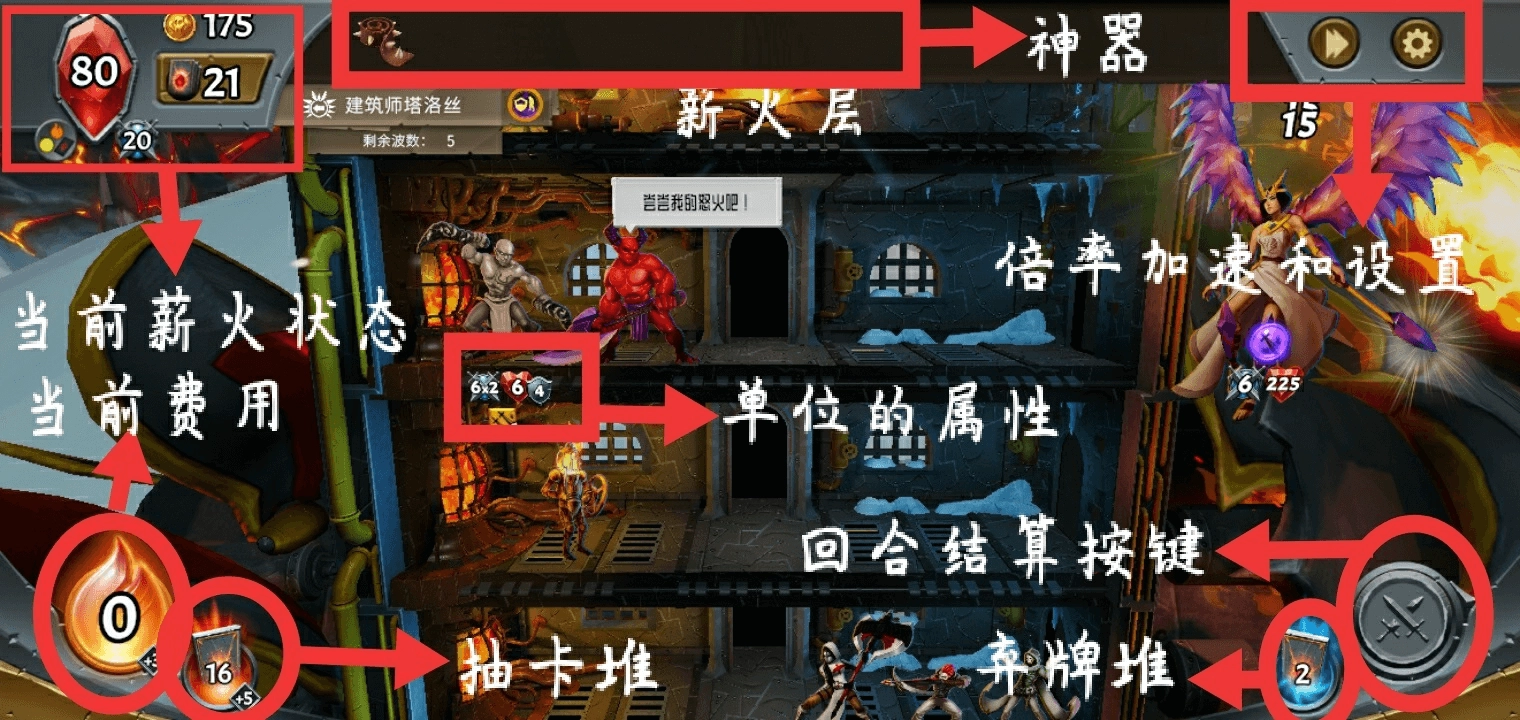 5.游戏界面的左上角会显示“剩余波数”,这个数值代表距离Boss登场还剩多少回合。一局游戏总共包含8次对战:其中五次普通关卡的Boss会在该关卡的最后一个回合出现;另外三次高难度关卡的Boss则会在关卡开始时就直接登场,并且从开局起就能被攻击。每一场对战的结束条件只有两个——要么Boss被击败,要么我方的“薪火”单位死亡。