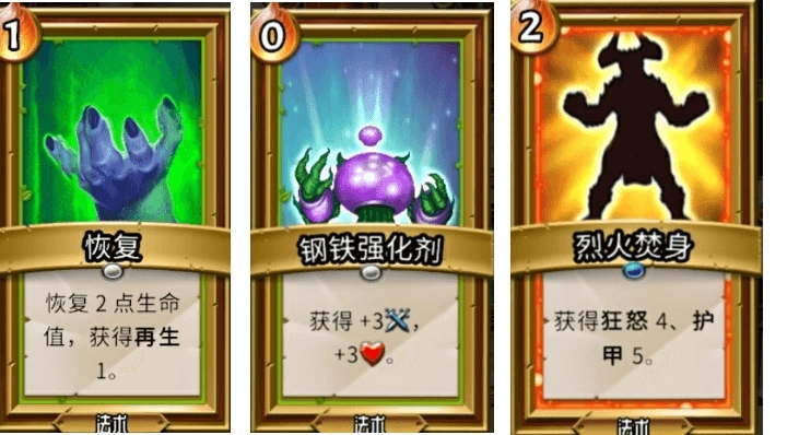这里有三张效果各异的法术牌,分别是治疗卡、基础属性(攻击力与生命值)强化卡以及增益卡。