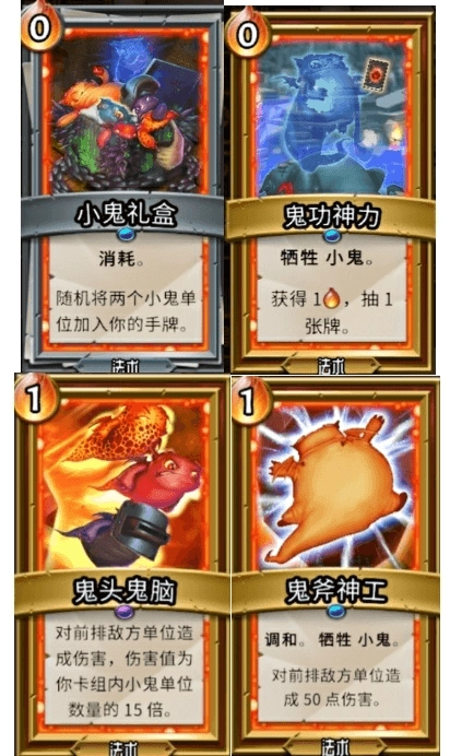 面对高血量的前排单位时,“鬼头鬼脑”与“鬼斧神工”这两个技能能打出高额伤害,而“小鬼盲盒”则可用于补充手牌数量。