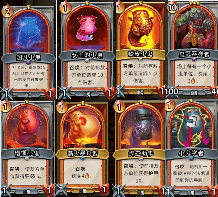 “小鬼回收”能确保每回合都有“小鬼”卡可用,“死者骨灰”可让“小鬼”卡的召唤效果额外触发一次,“女王之尾”能带来卡牌抽取与费用回复(不过作用有限),而“永恒之火”在减2费后,所有“小鬼”卡都能随意打出,不会出现卡手的情况。