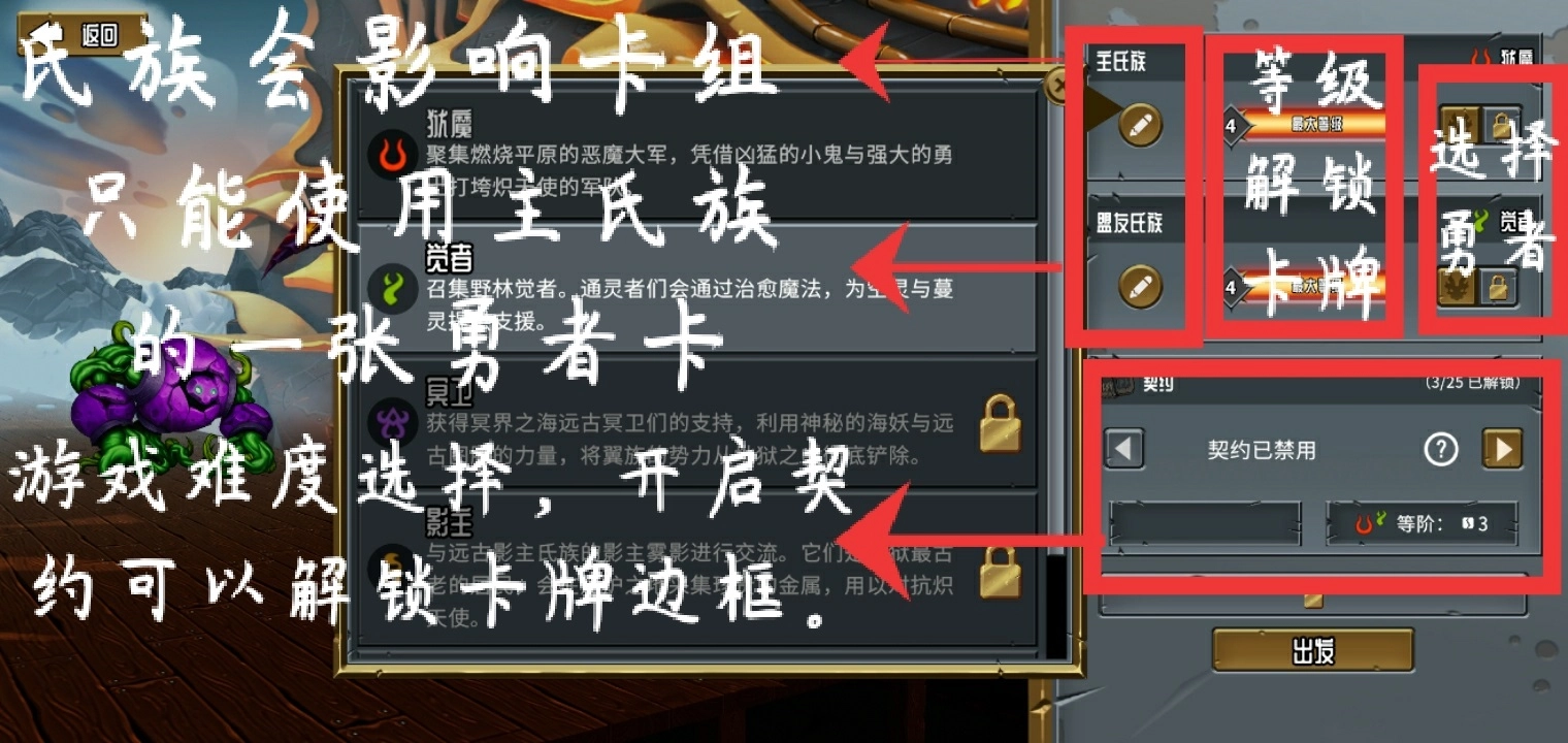 玩家使用的卡牌主要分为单位卡与法术卡两大类,其中单位卡还可进一步细分为勇者卡和非勇者卡。在每一局游戏中,玩家仅能使用主氏族的勇者牌。勇者牌的升级机制是独立于普通单位牌的,它无法通过商店进行升级,只有在通关一次大BOSS关卡后才能进行一次升级。并且,勇者牌的升级存在三个不同的方向,这三个方向各有特点,对游戏进程都会产生重要影响。如果选择的升级方向合适,且与卡组搭配得当,就能让玩家拥有强大的战斗能力;反之,则可能影响整体实力。因此,勇者卡的升级方向在很大程度上决定了卡组流派的强弱。