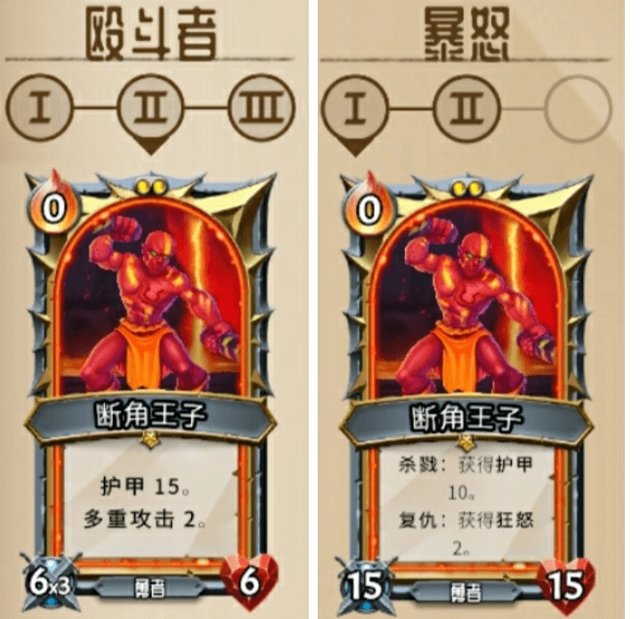 作为勇者卡的“断角王子”,它的升级路径分为两条:一条是提升到Ⅱ级的“殴斗者”,该等级能带来“多重攻击+2”的效果;另一条是升级至Ⅰ级的“暴怒”,此等级具备两项特性——击杀敌人可获取护甲以维持续航,受到攻击触发“复仇”时则会增加狂怒值。