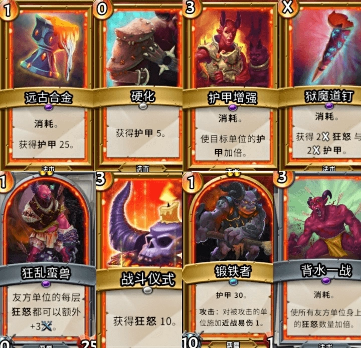 增加护甲与狂怒层数的卡牌无需多言,费用较低的可以搭配“双层”与“返回”效果,费用较高的则可组合“双层”加上“冰冻”或“减费”效果。