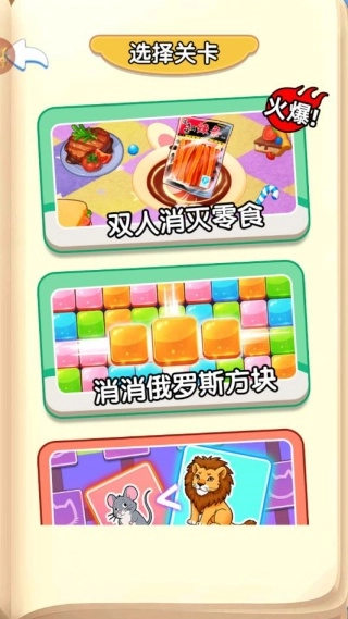 进入游戏后,首先要做的是选择关卡,比如双人消灭零食、消消俄罗斯方块这类的。