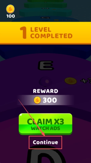 4、完成领奖:到达终点后会显示“100 LEVEL COMPLETED REWARD 300”,点击“Continue”按钮即可继续。