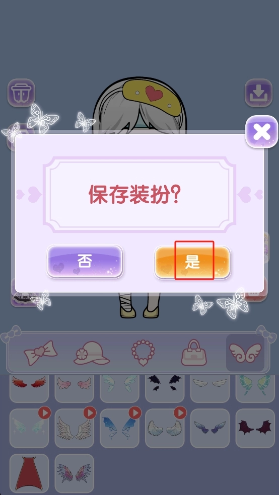 3、装扮完成后,系统会弹出是否保存装扮的提示,点击橙色的“是”按钮,即可留存当前设计,完成装扮流程。