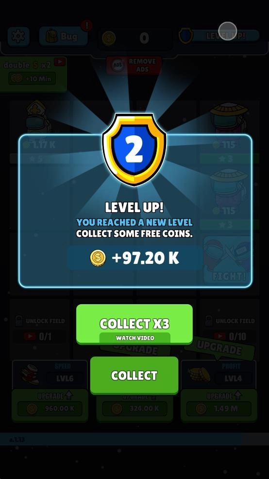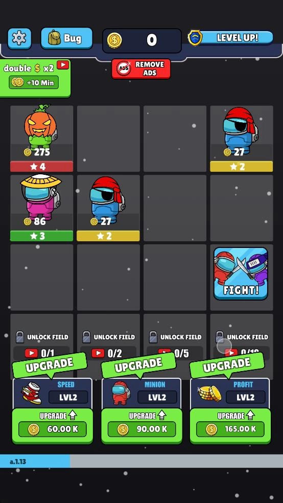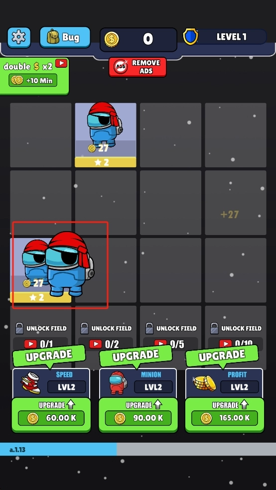 2、合并后可获得等级2的蓝色宇航员,此时需留意界面下方的速度、随从、收益三类升级选项,根据自身的游戏策略,消耗金币来升级相应的属性。