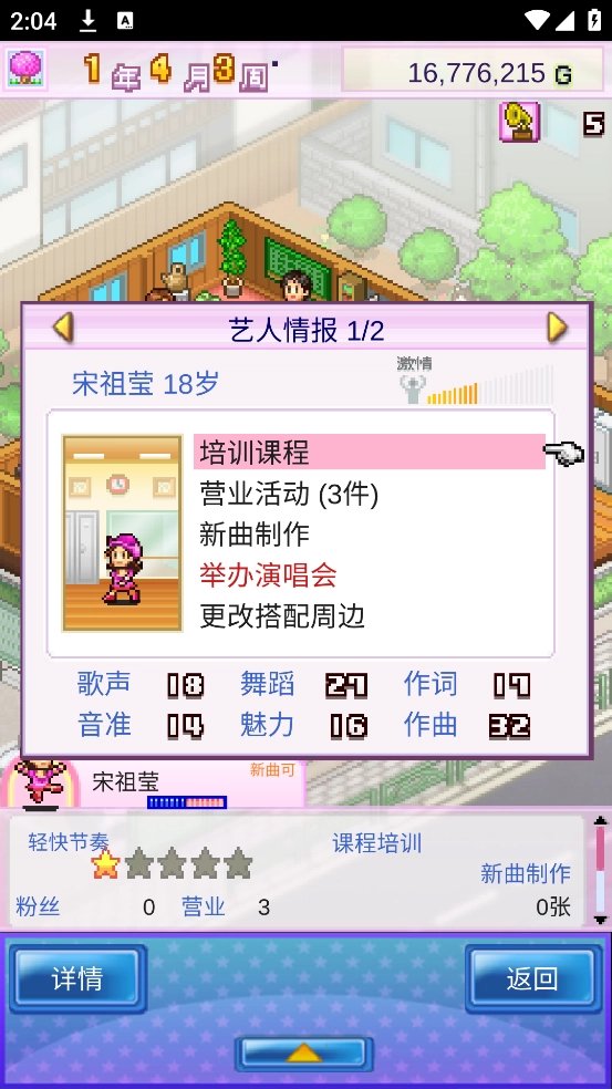 百万进行曲汉化版(百万乐曲物语)是一款趣味性十足且内容丰富的模拟经营游戏,核心玩法围绕艺人培养展开——玩家将化身经纪公司经营者,开启创业之旅。游戏整体难度适中,但需留意艺人的培养规划、各类活动安排以及相关新闻动态。