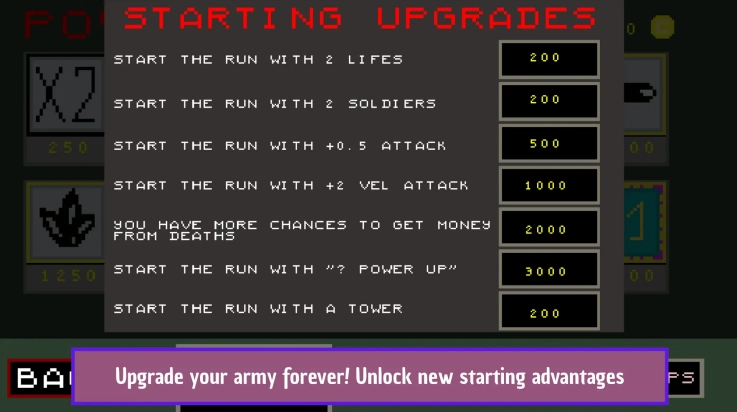 2、前往商店进行永久升级可强化你的军队。你能解锁7个以上的初始升级项,这些升级会在每次开始运行时就为你的部队提供增益效果。
