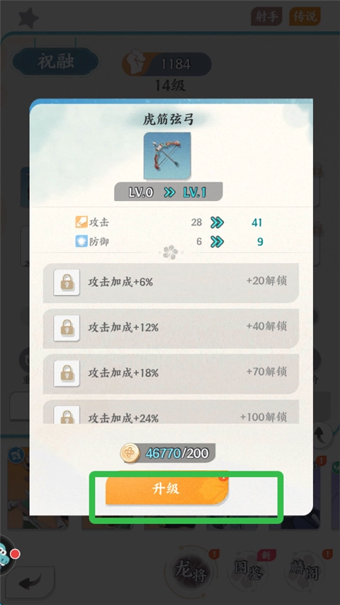 4、武将升到一定等级之后,可以进行装备升级。