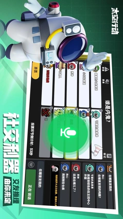 太空行动是一款趣味性十足的休闲益智游戏,采用精致的3D卡通风格打造,搭配各类Q萌角色造型,有着极强的游戏吸引力。玩家可参与多人策略玩法,踏入充满欢乐的推理世界——与其他玩家一同登上谜团重重的太空飞船,在过程中搜集线索、修复飞船,还要揪出潜藏其中的叛徒。游戏新增了丰富玩法,让互动乐趣无限延伸;玩家需仔细聆听每位玩家的发言,借助手中线索推理分析,找出真正的幕后黑手。此外,游戏还提供多种角色类型供选择,每个角色都有专属能力,合理发挥他们的实力就能顺利完成挑战。准备开启一场难忘的星际冒险吧,感兴趣的玩家千万不要错过,随时都能畅玩游戏、享受乐趣。