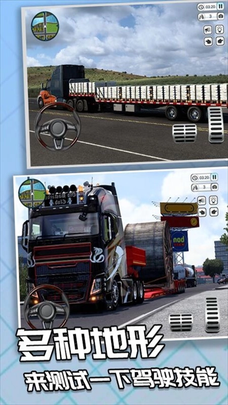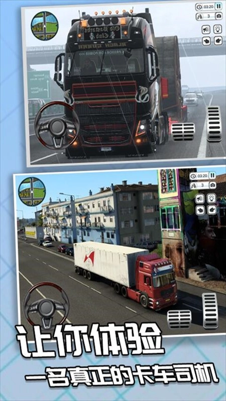 玩家能够感受卡车司机的日常工作,运送各式各样的货物,顺利抵达目的地后获取金币。