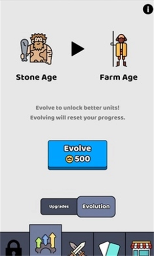 2、玩家完成每一关的挑战后,都能获得一定数量的金币奖励;这些金币奖励可用于在战斗外,通过画面左下角的升级选项来对时代进行升级。