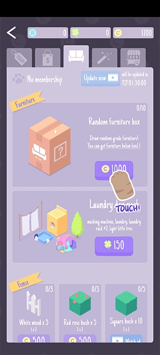 3、玩家能够依照引导进入商店,花费金币购买款式随机的家具设施。