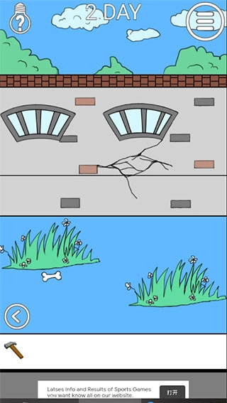 3、点击屏幕右下角的按钮进入右侧区域,接着按住锤子并拖动到带有裂纹的墙壁位置,这样就能砸出一个洞。