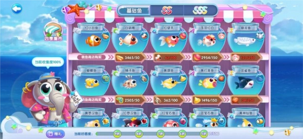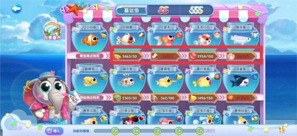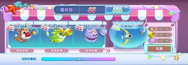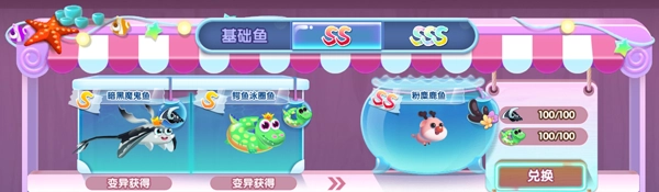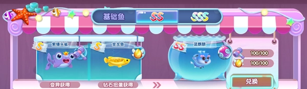 两个集市里的鱼儿种类各不相同,但玩法逻辑是一致的:都是先获取等级较低的基础鱼,利用它们产出鱼宝;再用得到的鱼宝去兑换等级更高的鱼,按照这样的方式一步步升级,最终就能获得SSS级的顶级鱼。