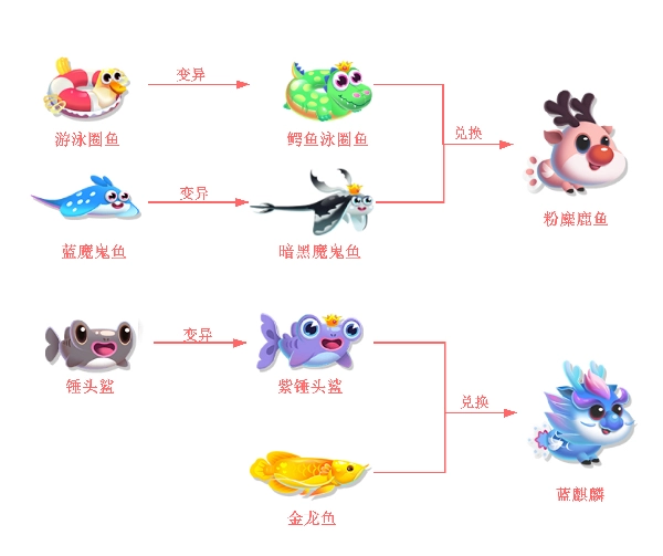 暗黑魔鬼鱼、鳄鱼泳圈鱼、紫锤头鲨这几种鱼,只要变异出其中一只就能直接饲养,接下来就可以着手兑换粉麋鹿鱼和蓝麒麟了。