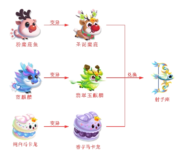 兑换射手座所需的三只SS鱼分别是圣诞麋鹿、翡翠玉麒麟和香芋马卡龙,而且这三只都属于变异鱼。