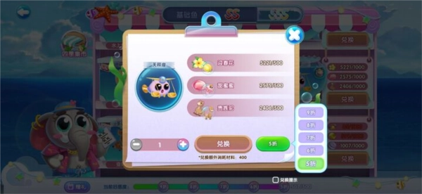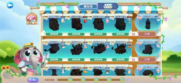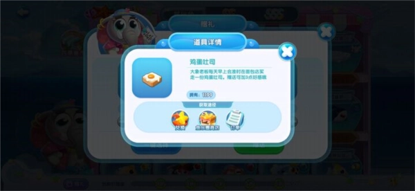 另外,细心的馆长或许已经留意到集市下方的大象先生了,他可不是单纯的摆设哦。点击下方的“送礼”按钮,给大象先生赠送礼物就能提升他的好感度。当好感度累积到一定数值,用集市上的鱼儿兑换物品时就能享受折扣啦。礼物的获取方式可以在道具详情界面查看,在萌鱼泡泡里获取礼物的途径十分丰富,除了前面提到的几种,出游时获得的宝箱中也能开出大象先生的礼物呢。