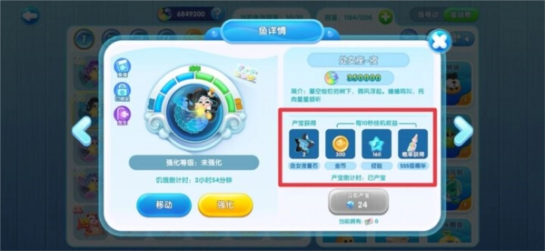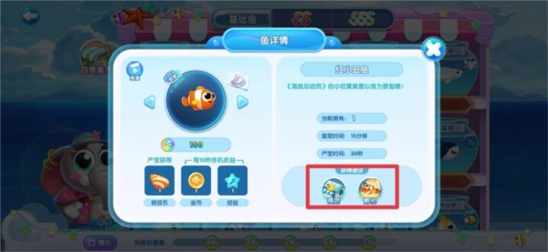 (着急的馆长可以使用加速剂来加快鱼儿成长)而且每个阶段的鱼儿都会产出一定的经验、金币,以及最重要的鱼宝。不同阶段的鱼儿带来的收益有所区别,具体信息可以通过鱼详情界面查看,内容如下: