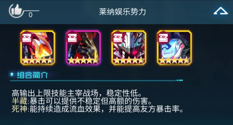 3、莱纳娱乐势力,推荐搭配典韦、死神、半藏、德古拉这几个角色,以此来提升该势力的作战能力。