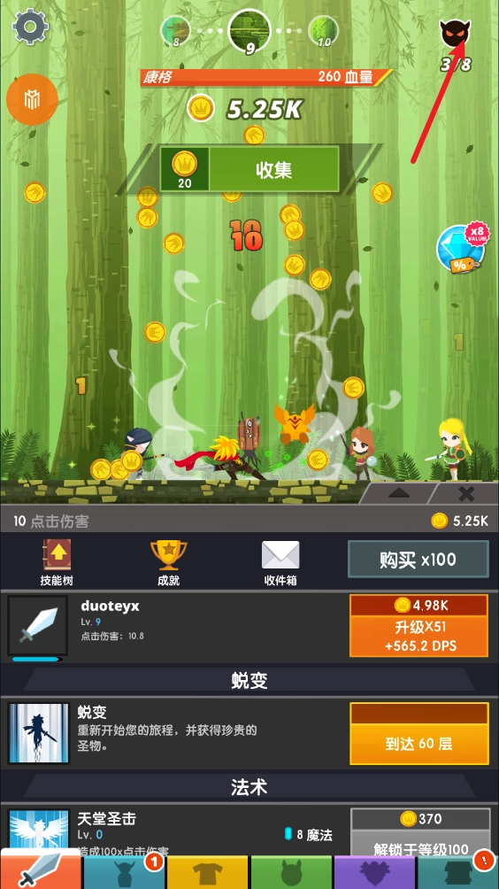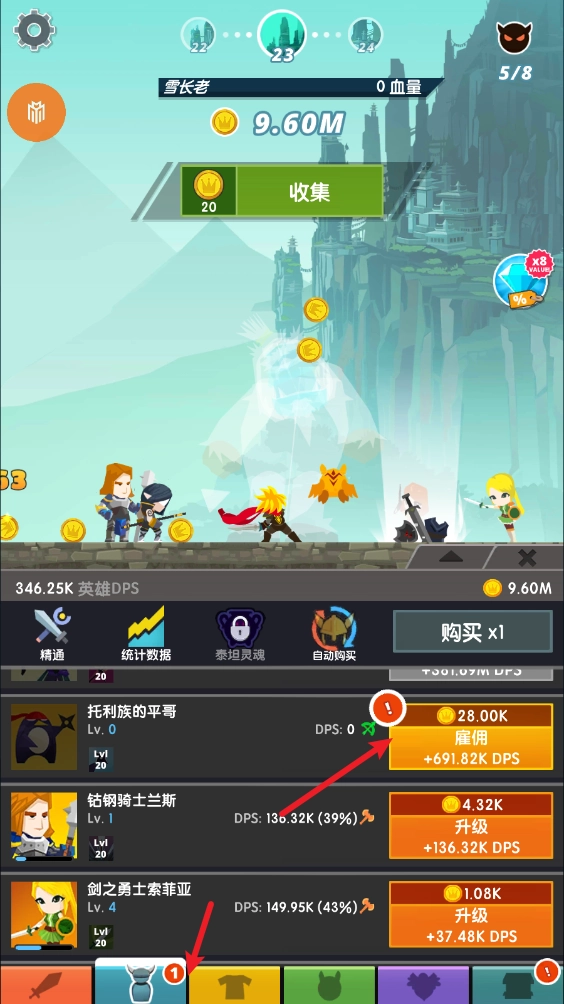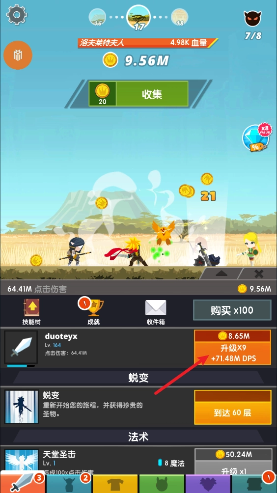 3、获得金币后,我们就可以对武器进行升级,从而提升点击所造成的伤害。