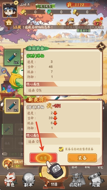 3.点击“出售”按钮可处理不需要的装备,若勾选新装备进行更换,系统会自动将原装备出售。