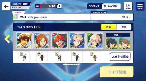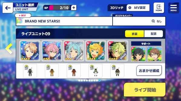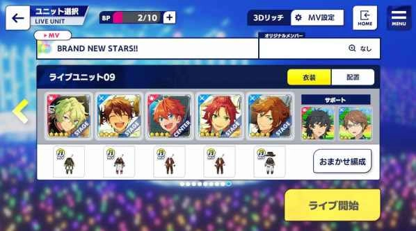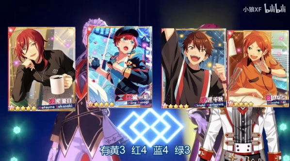 选择了和选曲界面音效相匹配的偶像来组建队伍,队伍中偶像的位置是固定的,实际呈现效果或许会与界面显示存在些许不同。