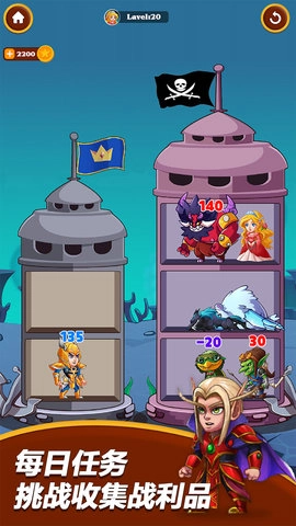 《刀塔营救》是一款融合休闲益智与策略角色扮演元素的游戏,玩家需巧妙操控英雄,战胜恶龙、收集战利品、消灭怪物,最终完成拯救公主的使命。游戏采用放置类策略解谜玩法,玩家需要通过思考来优化英雄与资源的运用,以高效达成游戏目标。