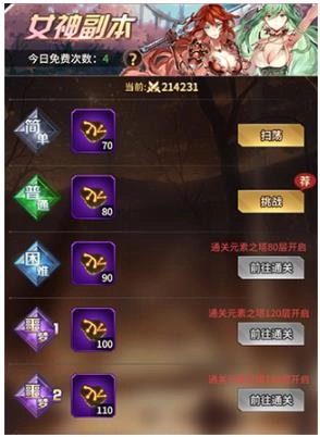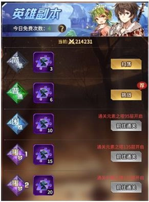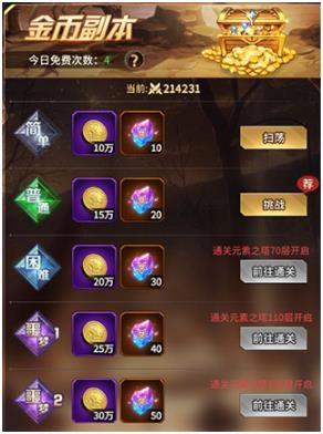 首先是我们每日需要完成的日常副本,这里是提升战力材料的主要获取渠道,包含灵力、金币、英雄、女神、装备副本以及后期解锁的符文副本。每个副本下方都设有一键扫荡功能,点击即可进行扫荡操作,该操作会消耗一定数量的钻石,并占用免费扫荡和钻石扫荡的次数。副本难度的开启需要通过提升元素之塔的通关层数来实现,随着难度提升,副本中可获得的材料数量也会相应增加。
