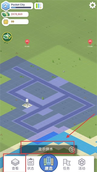 点击【显示供水】按钮可查看供水覆盖范围,再通过【建造】功能规划道路与供水设施,以此实现城市的合理布局。