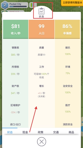 可以在【状态】面板查看人口增长情况(当前显示【+0】/秒,原因是无房可住),建议建造房屋来提升人口增长速度,同时要留意税收政策和居民幸福感的变化。