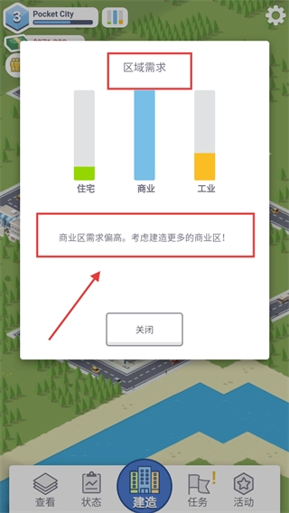 【区域需求】界面呈现商业需求偏高的情况,建议优先规划建设【商业区】来匹配这部分需求,以此让各区域的比例更趋平衡。