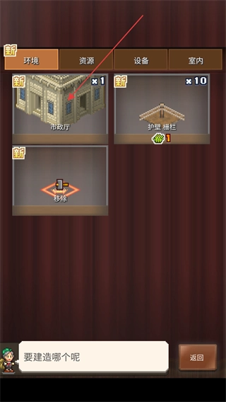 在环境、资源、设备、室内等不同建筑类别里定位到市政厅,双击将其选中。