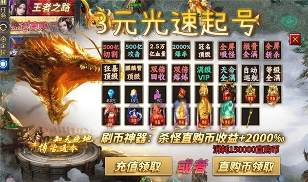 充值比例1:1,上线即可领取万亿切割、范围嘲讽技能,还能直接飙升至9999级!