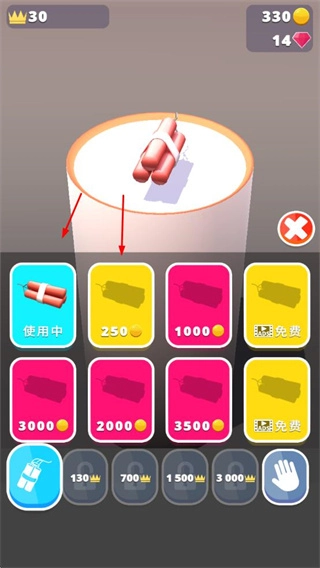 在道具选择界面,你可以用金币或者其他途径解锁各类爆破道具,然后挑选正在使用的道具来对建筑实施爆破。