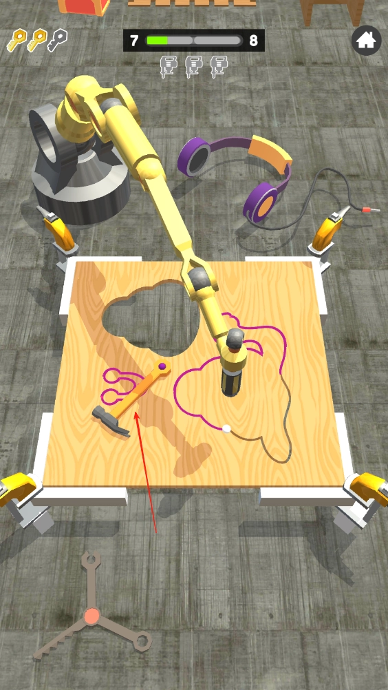 开局后用切割器将木板模型切割出来,切割的时候注意木板中间不停转圈的锤子障碍,撞上障碍会毁坏切割器,上方有损坏的机会。