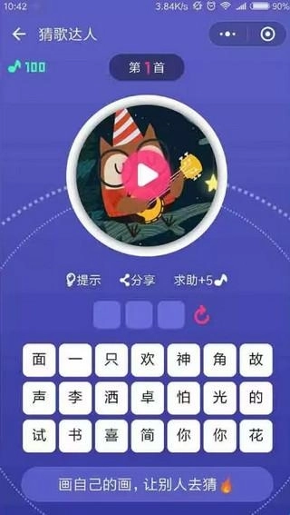 4、游戏界面设计得清晰直观,上方展示着歌曲内容,下方则是答题区域。你只需点击播放按钮聆听歌曲,接着把你认为正确的答案输入到下方的答题框里。如果回答正确,就能顺利进入下一关;要是答错了,要么重新开始挑战,要么可以向好友求助。
